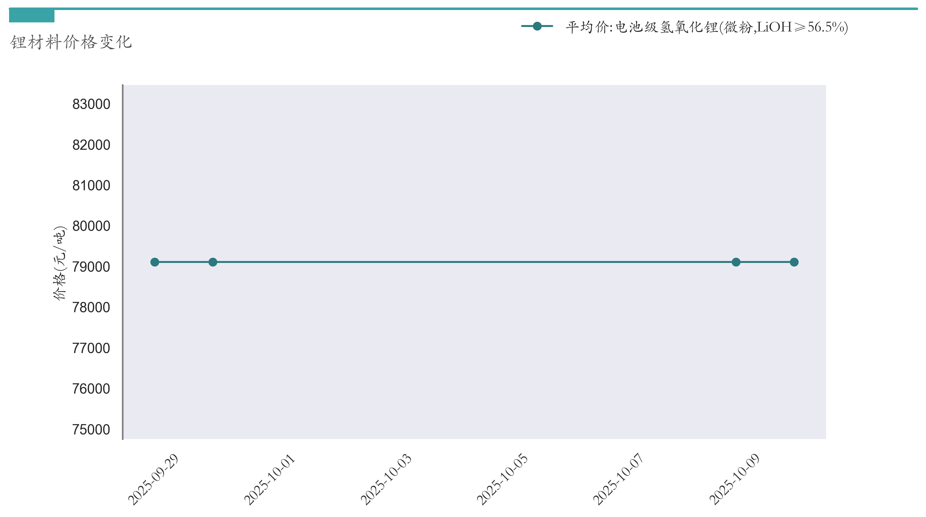 截至10月10日,电池级氢氧化锂平均报价为79100元/吨,较9月30日持平。近两周氢氧化锂价格变化如下图所示: