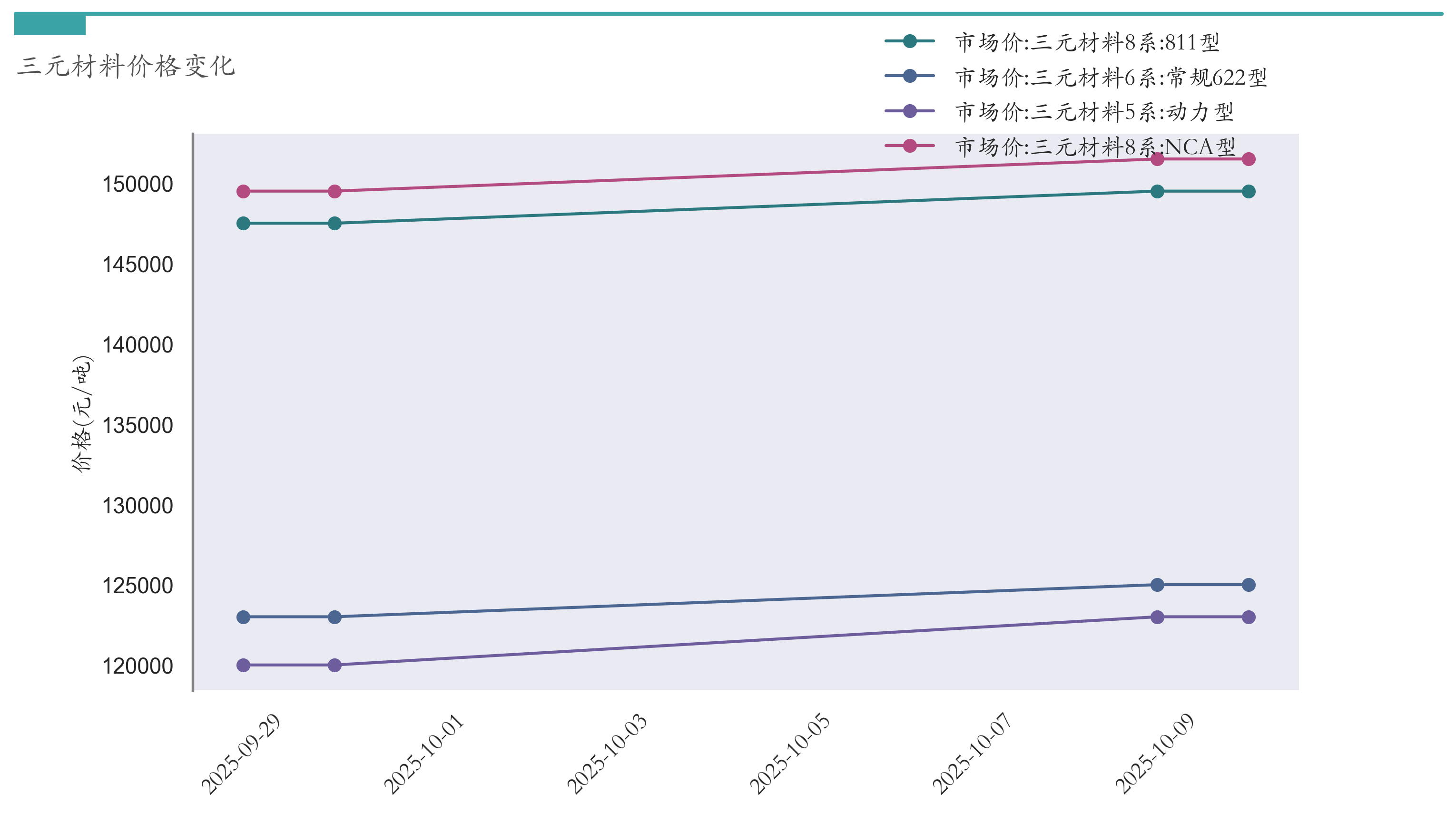 截至10月10日,三元材料8系:811型市场报价为149500元/吨,较9月30日上涨2000元/吨。三元材料8系:NCA型市场报价为151500元/吨,较9月30日上涨2000元/吨。三元材料6系:常规622型市场报价为125000元/吨,较9月30日上涨2000元/吨。三元材料5系:动力型市场报价为123000元/吨,较9月30日上涨3000元/吨。近两周三元材料价格变化如下图所示: