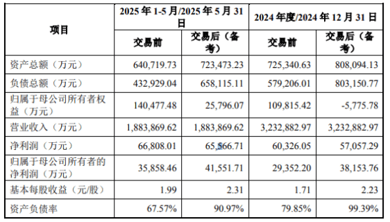据2025年8月万辰生物公告,公司拟以13.79亿元现金收购南京万优股权,交易完成后负债总额将从43.29亿元涨至65.81亿元,资产负债率从67.57%升至90.97%(对比时间为2025年5月31日前后)。