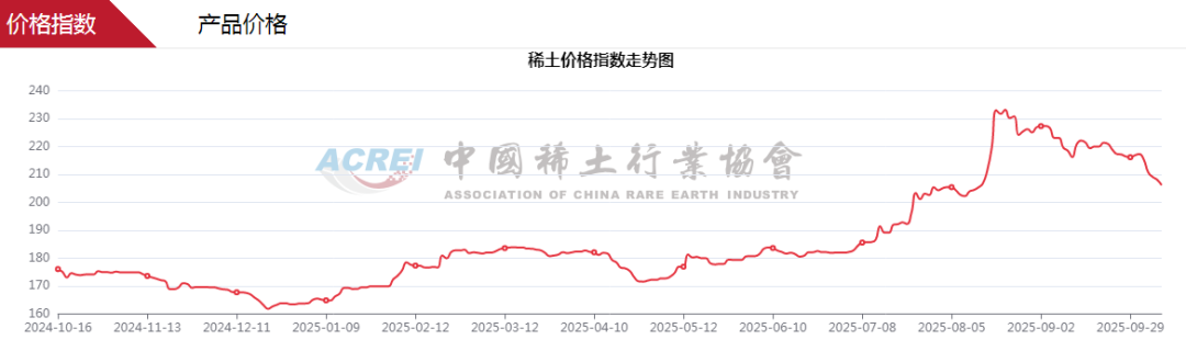 仅以中国稀土行业协会的稀土价格指数为例,今年7月、8月该指数便出现一轮明显上行,并于8月中旬创下233点的年内新高,较2024年末上涨近43%。
