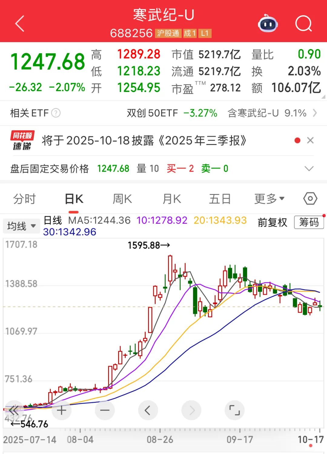 该股最新收盘价为1247.68元/股,市值近5220亿元,股价低于1455元/股的贵州茅台。值得注意的是,根据公司披露的数据显示,“牛散”章建平第三季度持续加仓寒武纪-U,其间持股数量增加约32万股,截至第三季度末,合计持股超过640万股,占总股本的比例为1.53%,对应最新市值达84.89亿元。截至目前,章建平已升至寒武纪第五大股东。