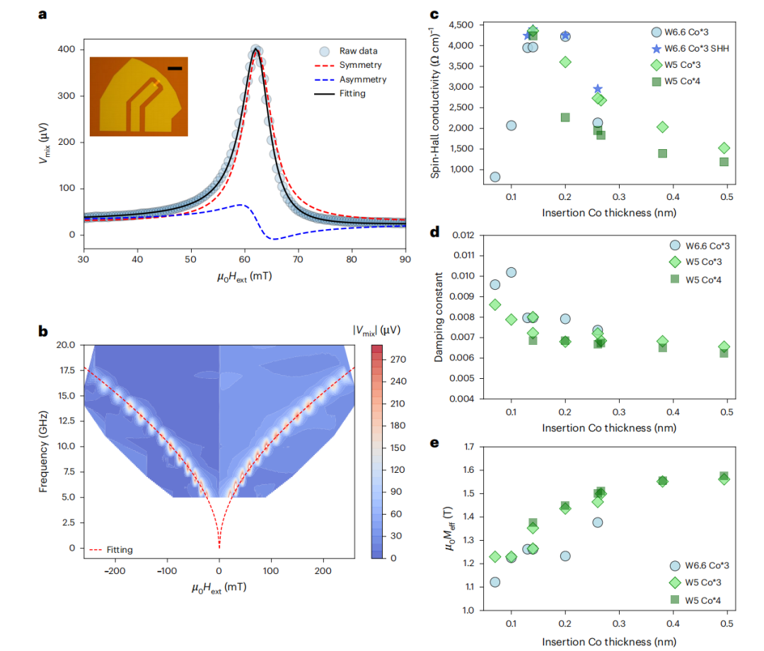 更重要的是,这种复合结构不仅解决了热稳定性问题,还保持了优异的自旋转换效率。通过自旋扭矩铁磁共振和谐波霍尔电阻测量,团队测得复合钨薄膜的自旋霍尔电导率约为4500 Ω⁻¹·cm⁻¹,阻尼类扭矩效率约为0.61,这些参数确保了高效的磁化翻转性能。