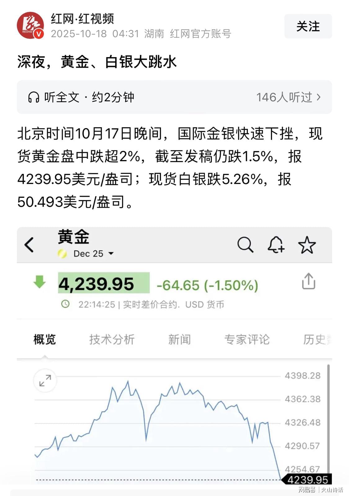 值得一提的是,据媒体报道,北京时间10月17日晚间,国际金银快速下挫,现货黄金盘中跌超2%,截至发稿仍跌1.5%,报4239.95美元/盎司;现货白银跌5.26%,报50.493美元/盎司。
