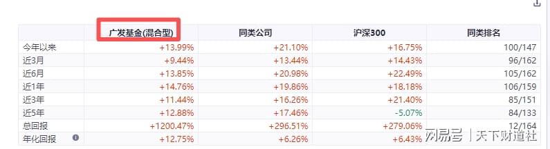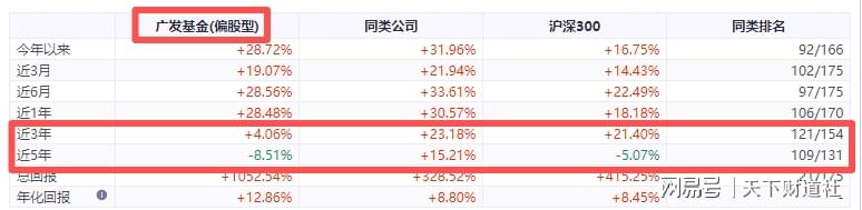 广发基金虽然管理规模业内靠前,成立以来偏股型和混合型产品的总回报也比较突出,但同花顺iFinD显示,其相关产品的近3年、近5年的收益相对不佳,分别约为4%、-9%,远远不及同类公司超23%、15%的收益,同类排名也明显靠后。