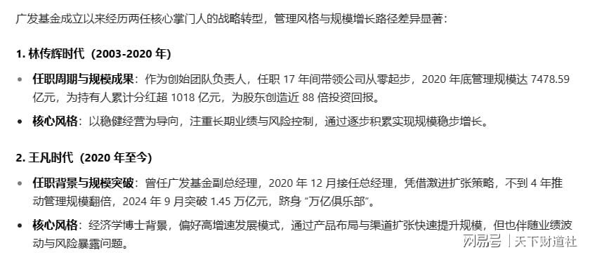 成立至今,广发基金共经历了两任总经理,根据知名平台豆包的检索结果显示,两人的战略导向与经营风格差异较为明显。