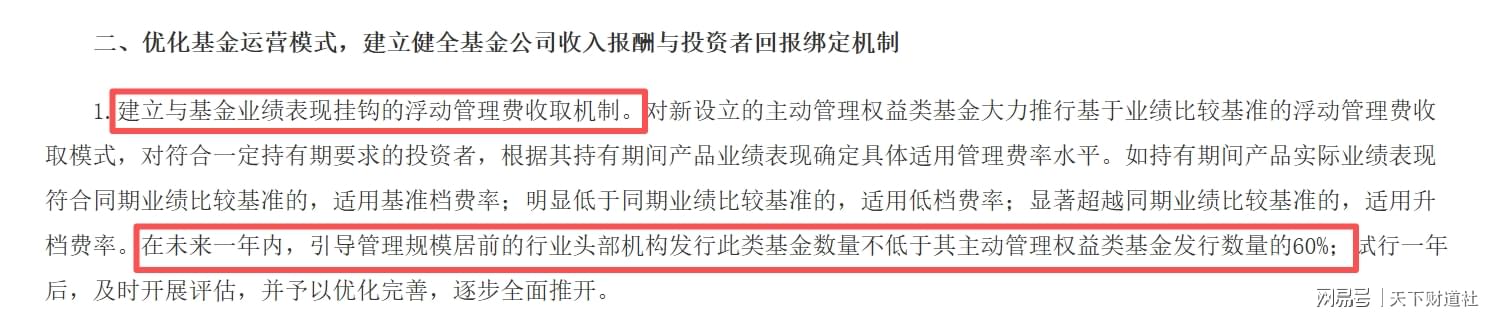 今年5月,中国证监会发布《推动公募基金高质量发展行动方案》,提到“施行与业绩浮动管理费率机制”,并提到,“在未来一年内,引导管理规模居前的行业头部机构发行此类基金数量不低于其主动管理权益类基金发行数量的60%”。