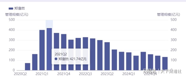 2021年,郑澄然凭借在新能源赛道的布局,取得超额收益,当年二季度末管理规模最高时接近422亿元。