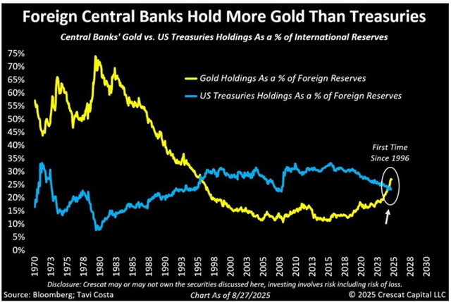 从1996年到2025年,整整29年后,黄金在全球央行储备中的占比再次超过美债。这个历史性转折点传递的信号很清晰:旧秩序在瓦解,新平衡在重塑。