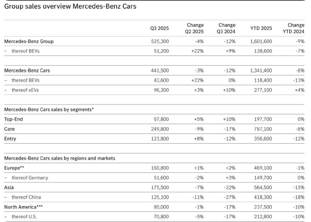 当然,节约成本的背后是奔驰业绩的下滑。近几年,随着电动化的快速发展,奔驰在市场的份额也遭到了严重的缩减,营收与利润都出现了下滑。相关数据显示:去年奔驰营业收入为1455.94亿欧元,与上年同期相比下降4.5%。毛利方面,去年毛利为285.76亿欧元,同比下跌19.5%。税后净利润方面,去年净利润为104.09亿欧元,同比下降28.4%。进入2025年,奔驰的业绩还在继续下滑。据官方公布的最新第三季度销量来看,今年三季度,奔驰全球销量52.53万辆,同比下降12%。其中,美国市场与中国市场都出现了同比下滑。今年三季度奔驰在美销量为80000辆,与去年同期相比下降17%。国内市场三季度销量为125100辆,与去年同期相比下降27%。