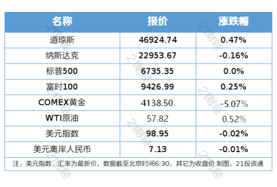 纽约股市三大股指10月21日涨跌不一。截至当天收盘,道琼斯工业平均指数比前一交易日上涨218.16点,收于46924.74点,涨幅为0.47%;标准普尔500种股票指数上涨0.22点,收于6735.35点;纳斯达克综合指数下跌36.88点,收于22953.67点,跌幅为0.16%。