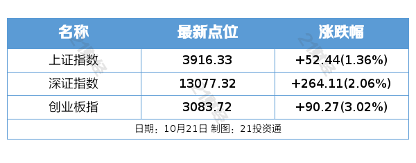 10月21日,A股三大指数集体上涨,截至收盘,上证指数涨1.36%,深证成指涨2.06%,创业板指涨3.02%,北证50涨2.04%。沪深京三市全天成交额18927亿元,较上日放量1414亿元。全市场超4600只个股上涨。板块题材上,页岩气、苹果概念、工程机械、CPO、房地产、存储芯片板块涨幅居前;煤炭、燃气、贵金属板块表现落后。