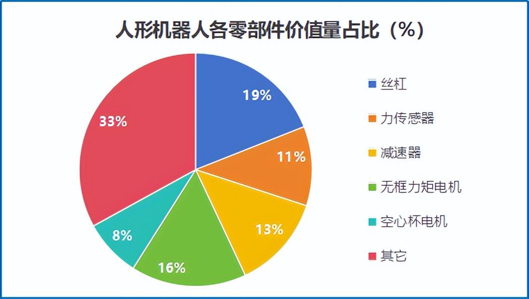 丝杠就是机器人关节的“动力传输带”,相当于人的肌腱,机器人走路、抓东西全靠它,价值量在全部零部件中占比达19%。