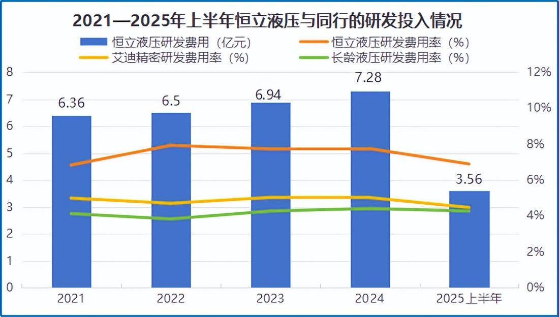这份辉煌背后,是公司对研发的执着投入。2021-2024年,恒立液压每年研发投入都超6亿,研发费用率在7%左右,比长龄液压、艾迪精密这些同行都舍得砸钱。