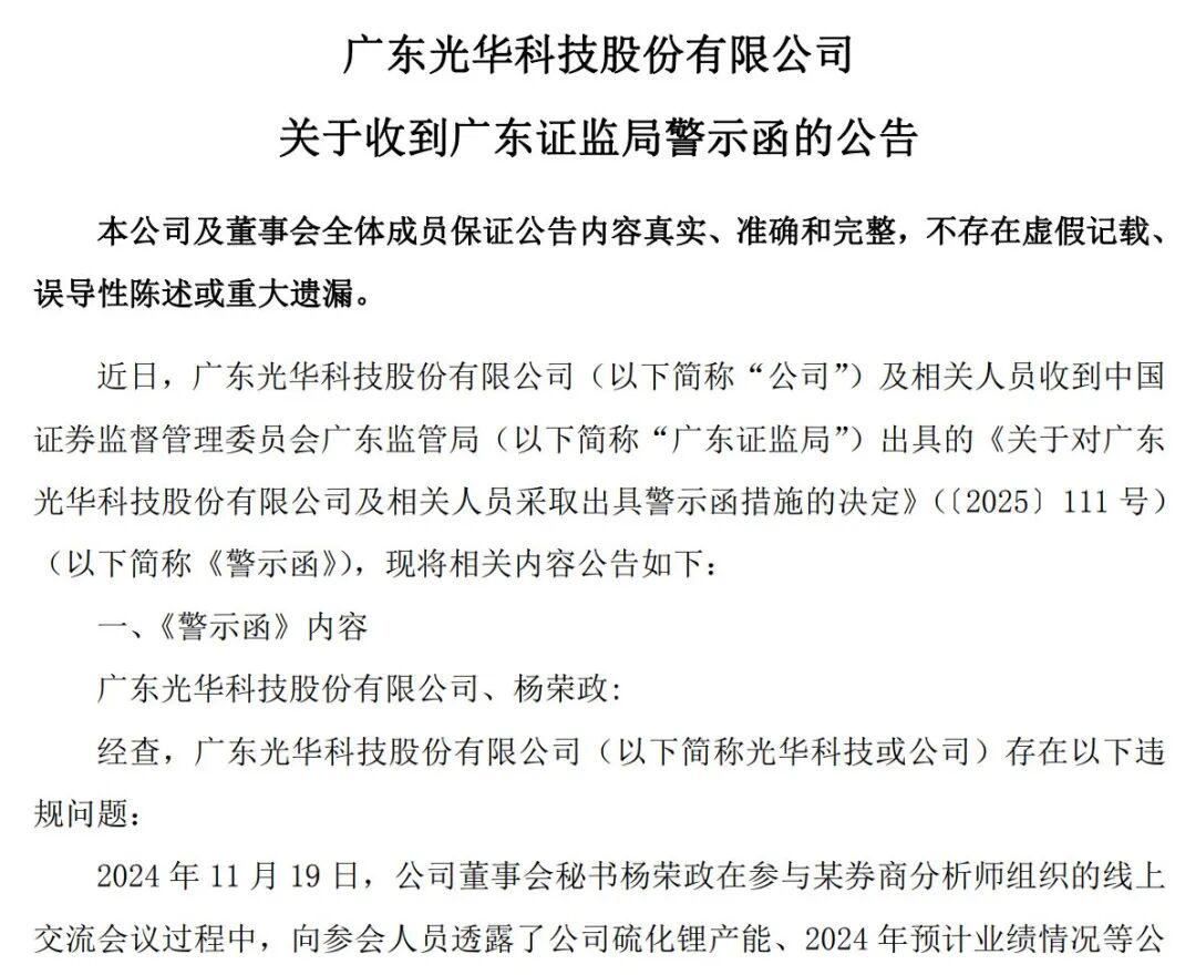 10月21日晚间,光华科技(002741.SZ,股价21.29元,市值99亿元)公告称,公司及相关人员收到广东证监局出具的《关于对广东光华科技股份有限公司及相关人员采取出具警示函措施的决定》(下称《警示函》)。