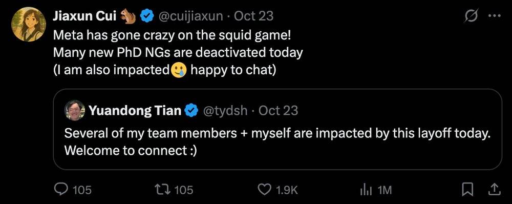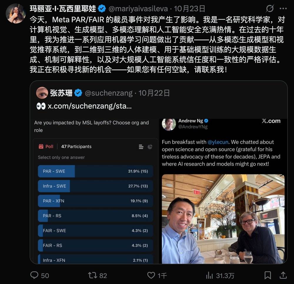 除TBD实验室之外,Meta 其他的 AI 团队经历着重大的人事变化,许多工程师看到自己的同事被解雇,这也是硅谷AI团队迄今为止遭遇的最大规模裁员。