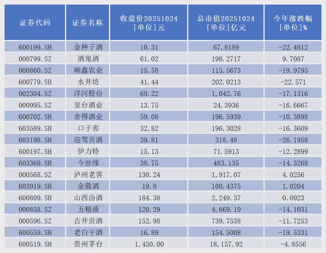 从二级市场表现看,今年以来,白酒行业整体的下跌幅度几乎在全行业中靠前。截至10月24日收盘,迎驾贡酒、水井坊、金种子酒、顺鑫农业、老白干酒、洋河股份、皇台酒业、口子窖、今世缘、五粮液、伊力特、古井贡酒、舍得酒业13家公司股价跌幅均超过10%。