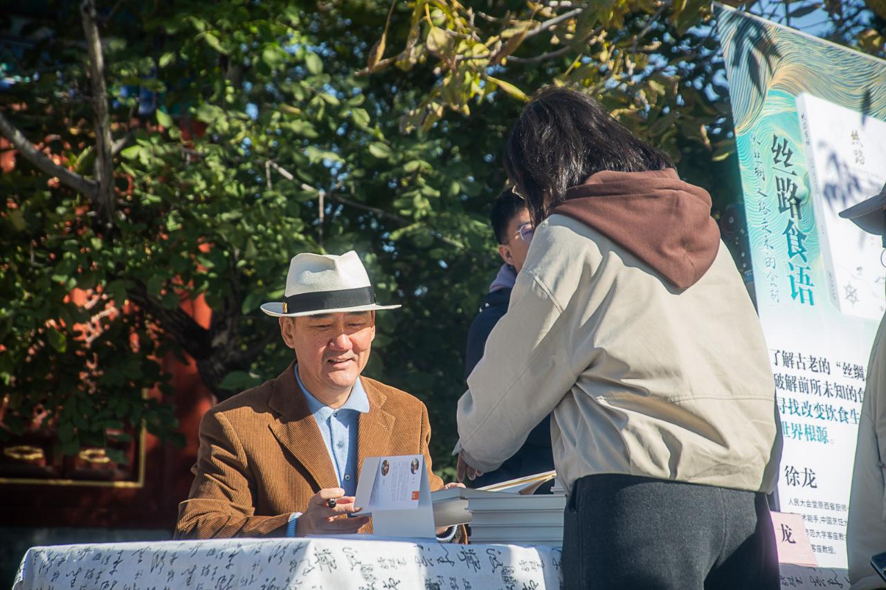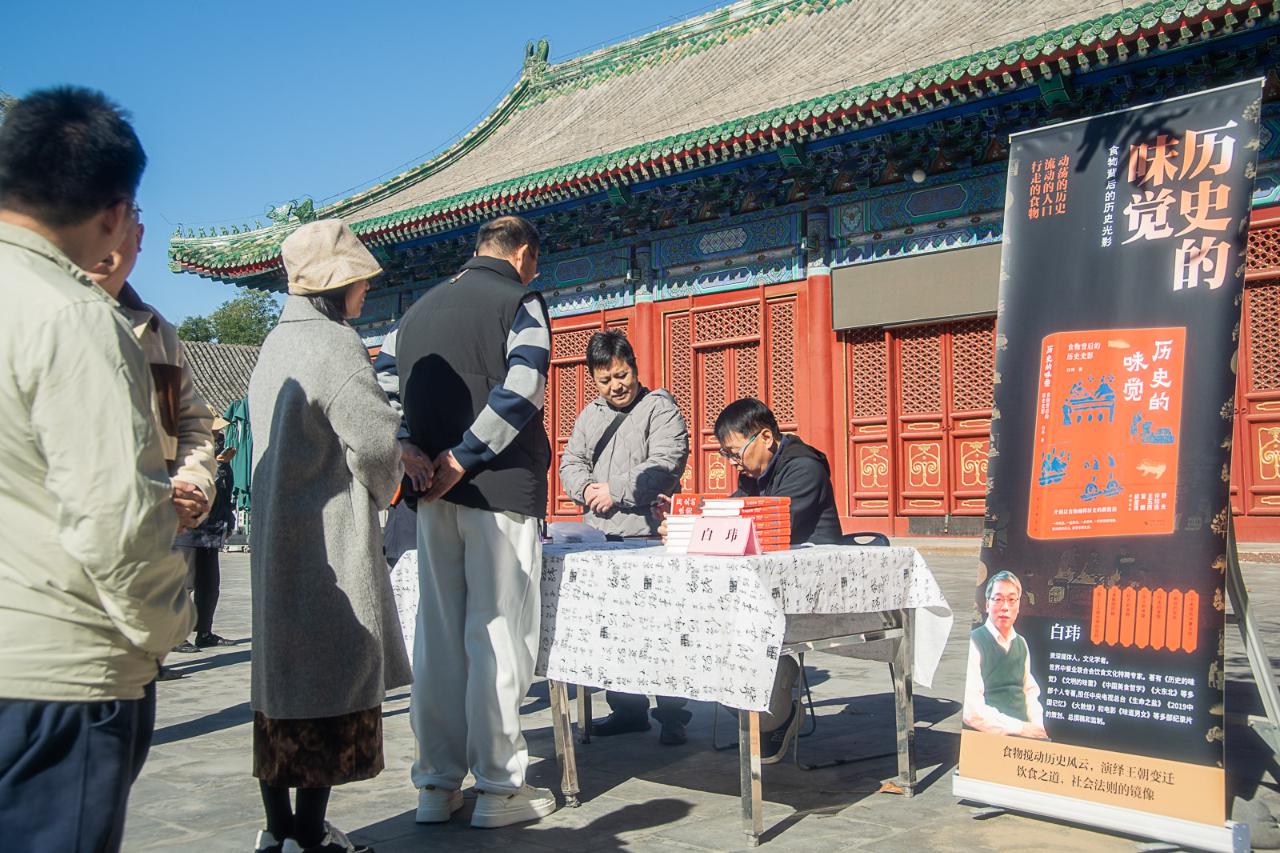 三场作者签售活动则进一步拉近了理论与实践的距离。中国食文化研究会副会长朱永松通过《美食美器宜帮菜》《中华二十四节气养生宴》探讨了地方菜系与节气文化的当代价值。“饮食文化是活的遗产,我们研究地方菜和节气宴,不仅是整理技艺,更希望激活其中蕴含的生活智慧,让它能引导当代人的健康饮食与生活。”朱永松说。中国烹饪大师、人民大会堂原西餐厨师长徐龙携新作《丝路食语》与读者见面。这部历时七年完成的著作,是徐龙自费考察30余国、查阅大量古籍的成果。他特别提到,研究中参考了众多考古文献与历史记载,“像破解密码般梳理每个食材的原产地、传播路径及在中国古籍中的最早记载”。资深媒体人、文化学者白玮带来新作《历史的味觉》,从哲学与历史维度解析饮食文化的深层内涵。谈及此次签售,他表示:“报国寺很有老北京城的气质,而且这次主题与《历史的味觉》所探讨的主题相得益彰。在这种充满历史氛围感的空间里分享新作,别有一番韵味。”他也希望通过这本新作,让读者们认识到“食物不仅仅是口腹之欲,更关乎国计民生”,在品尝美食的同时,更深入地理解中国传统文化的根基与博大精深。