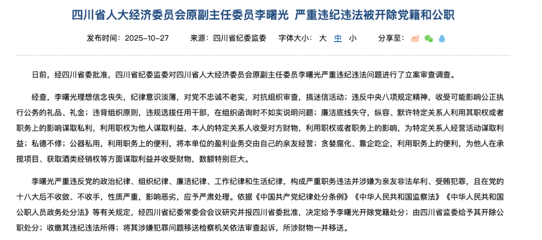 10月27日,四川省纪委监委官网发布通告,四川省人大经济委员会原副主任委员李曙光严重违纪违法,被开除党籍和公职。