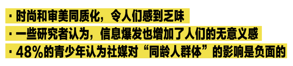 由此可见,这代人面对着一个特别的矛盾。他们因快速且过多的微趋势而感到无聊和疲惫,试图脱离社媒的裹挟、发展自我的形象,却又在流量的烘托之下无法拒绝追随它。