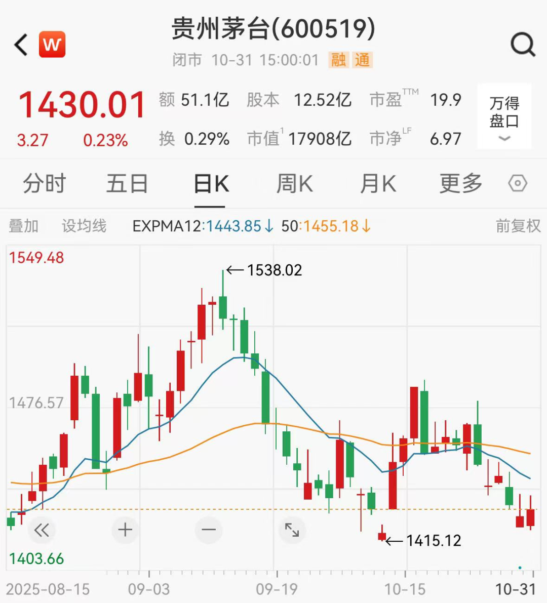 截至10月31日,贵州茅台报收1430.01元/股,最新市值1.79万亿元。从公募基金的持仓情况看,在今年二季度末还是公募第三大重仓股的贵州茅台,三季度末已跌至公募第十大重仓股。此外,五粮液、山西汾酒掉出公募基金前20大重仓股。