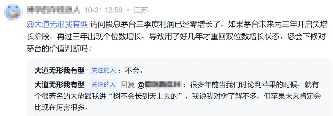 有网友向段永平提问贵州茅台业绩情况:“如果茅台未来两三年开启负增长阶段,再过三年出现个位数增长,导致用了好几年才重回双位数增长状态,您会下修对茅台的价值判断吗?”