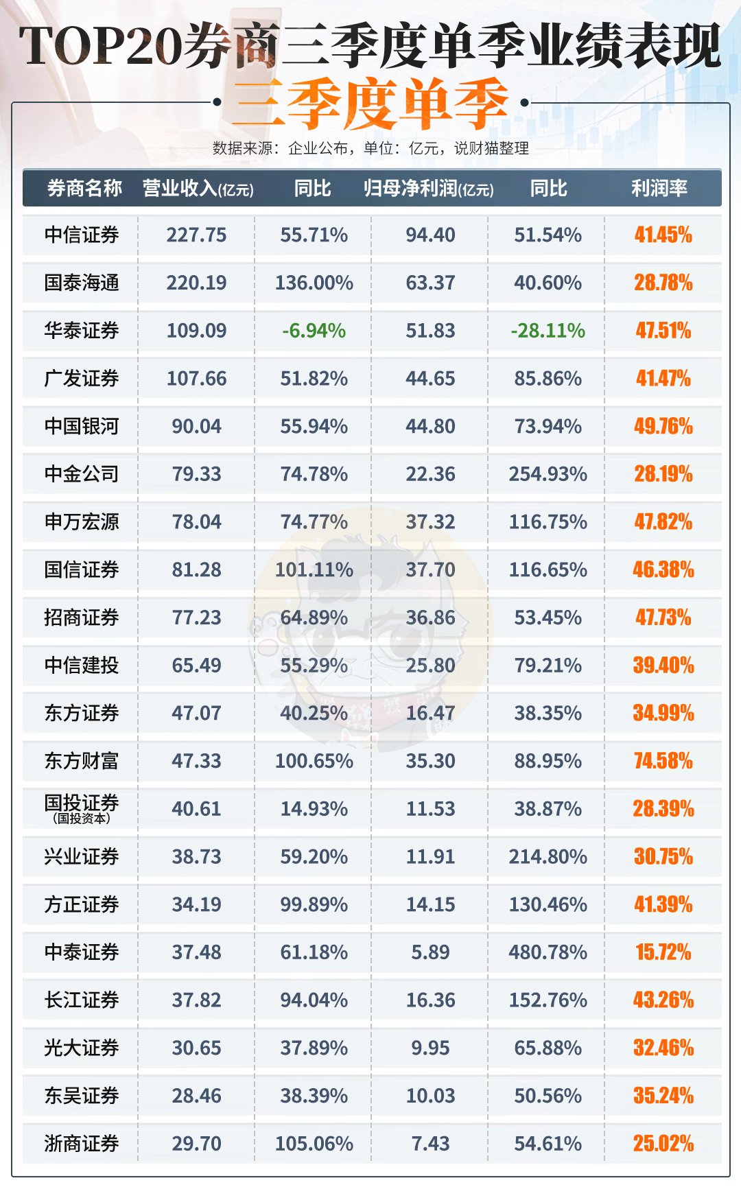 看,TOP20券商三季度单季的业绩表现,除了华泰证券是跌的,其他全部都是上涨的!
