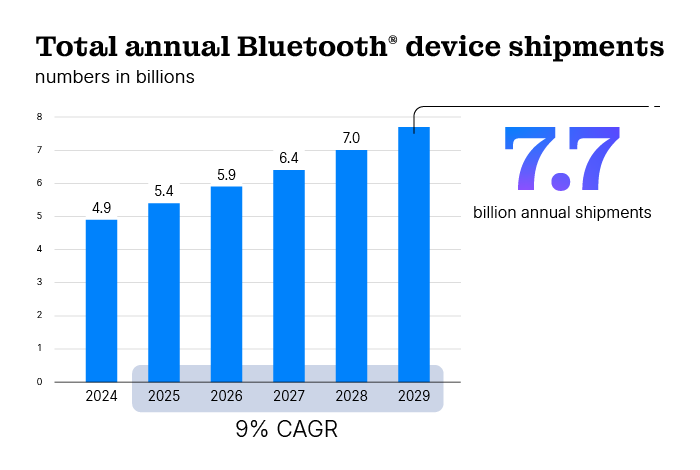 蓝牙技术联盟今年 5 月发布的报告显示,预估 2025 年全球蓝牙设备出货量达到 54 亿台,并有望在 2029 年达到 77 亿台,五年复合增长率达到 9%。报告还特别强调,低功耗蓝牙(BLE)设备的增长尤为迅猛,年增长率达到 22%,预计到 2028 年,单模低功耗蓝牙设备的出货量将与传统的双模蓝牙设备持平。