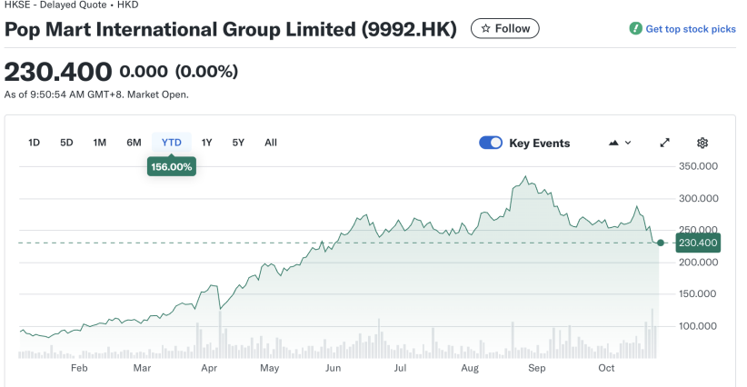 下跌最早从其美股ADR(PMRTY)开始,夜盘下跌约10%(成交量是平时6倍)。此外,同类潮玩IP日本三丽鸥(Sanrio)当日也下跌(-3.1%),其他“新消费”板块的股票也受到拖累。