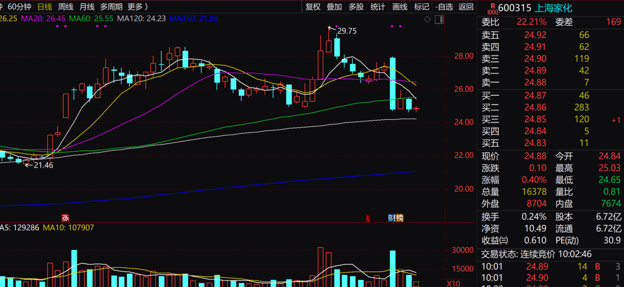 财报发布当日,上海家化股价报收于27.36元,仅微涨0.77%。戏剧性的是,10月28日股价开盘就直线跳水,单日跌幅达9.43%,收盘价跌至24.78元,随后两日其股价在25元左右震荡。股价如此走势也折射出资本市场的审慎态度。