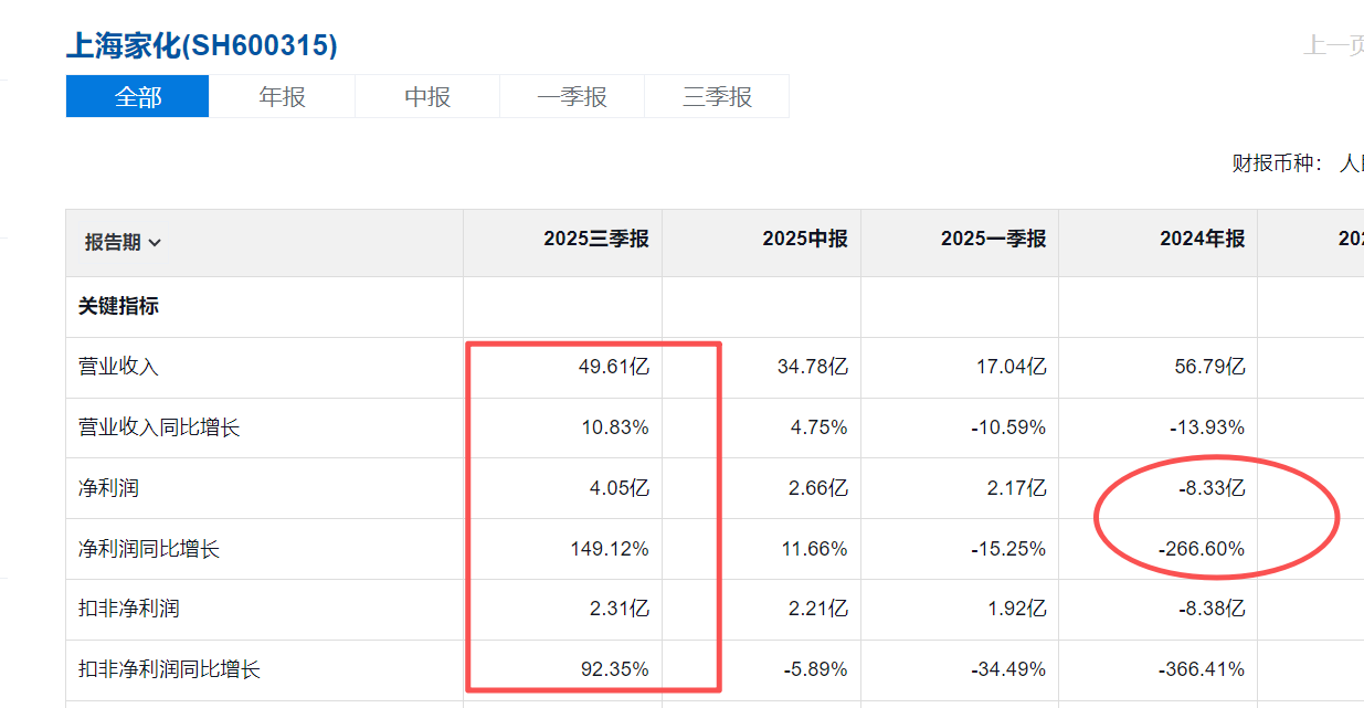效果还是较为明显。从2025年第二季度开始,上海家化营收和净利润同比都迎来了正增长,到三季度更是有点“井喷”式增长。