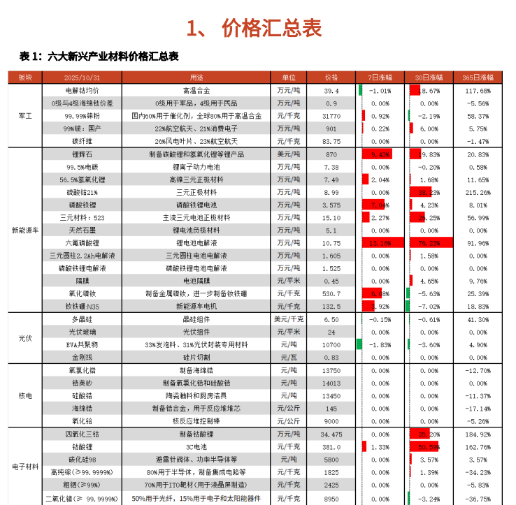 另外光大证券研报,近1年涨幅来看,六氟磷酸锂涨了91.96%;光伏中的多晶硅涨了41%,电解钴涨了117%。而就30日涨幅来看,六氟磷酸锂暴涨76%。