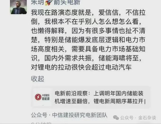 其实,这不是朱玥第一次对电池、储能看好,就在10月29日储能、锂电爆发之际,朱玥朋友圈发文:我的路演态度局势,爱信信,不信拉倒,懒得解释。他高呼“储能海啸将至”,很多事情也扯不清楚,特别是储能爆发底层逻辑和电力市场高度相关,国内外需求共振,储能海啸将至,对锂电的拉动很快会超过电动汽车。