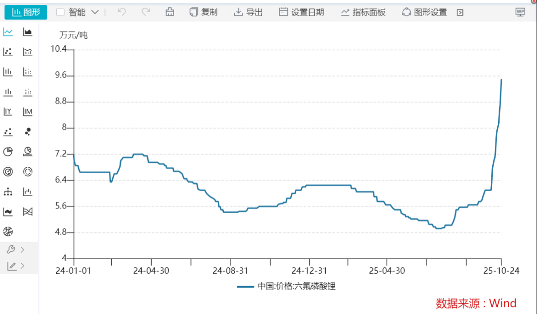 据金石杂谈查询wind数据,六氟磷酸锂一直处于涨价周期,8月初还不到6万元,3个月时间就到了10万(截至10月24日,价格为9.5万元/顿)