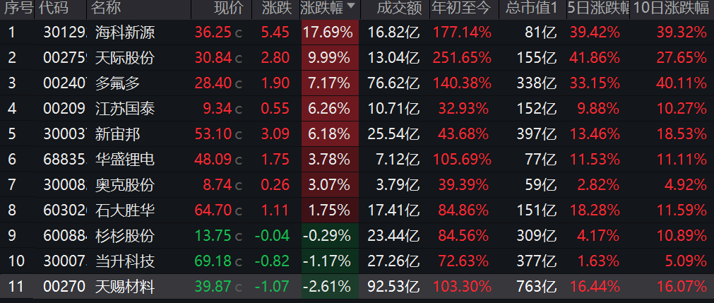 但是,到了尾盘风云突变,海科新源20cm涨停开板,多氟多从涨停到收涨7%,江苏国泰从涨停到收涨6%,新宙邦、石大胜华等纷纷大跳水,近期的大牛股天赐材料更是从一度逼近涨停到收盘倒跌2.6%。
