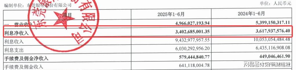 从营收结构看,更能看出问题的实质。2025年上半年,利息净收入作为核心收入来源,同比减少近6%至34亿元,成为拖累东莞银行营收的主因。