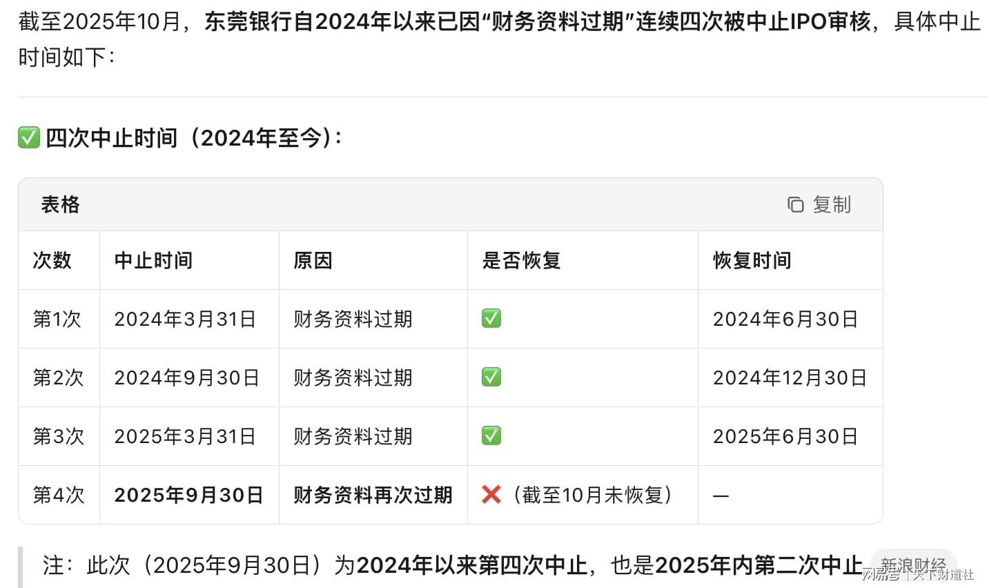 日前,深交所官网显示,东莞银行因IPO申请文件中的财务资料过有效期,被中止审查。