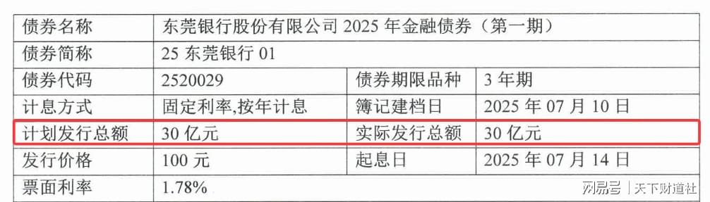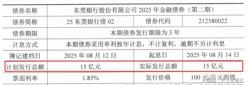 2025年7月10日、8月12日东莞银行又分别发行金融债30亿元、15亿元。