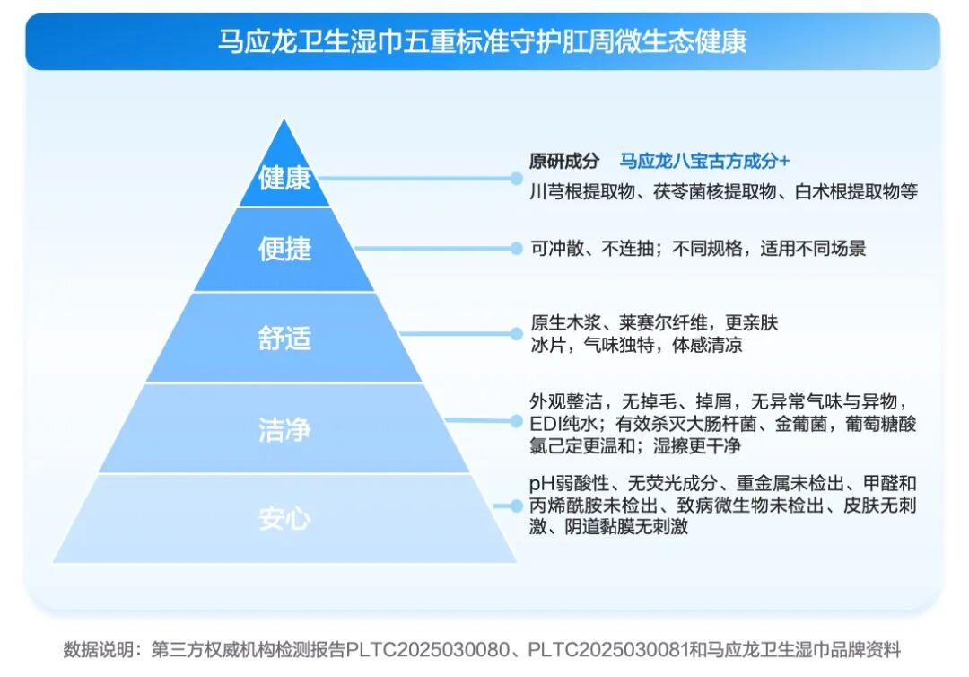 在这场变革中,马应龙作为行业引领者,率先落实新国标,通过构建安心、洁净、舒适、便捷、健康五重标准,共同守护肛周微生态健康,为消费者提供肛周健康养护新选择。