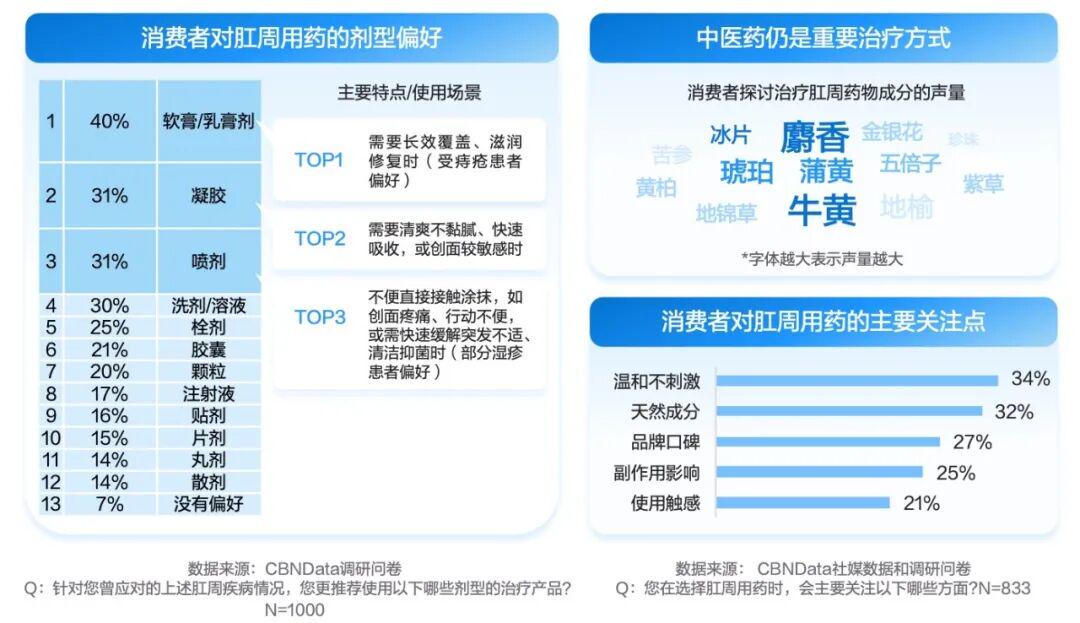 当已经出现症状时,科学的诊断与治疗便成为破局关键。白皮书发现,诊疗环节正在呈现出明显的线上化趋势——75%的受访者通过线上渠道获取医疗信息与帮助。在用药选择上,软膏/乳膏剂、凝胶等剂型最受青睐。尤为引人注目的是,中医药在肛周治疗中仍占据重要地位,麝香、牛黄等中药成分在社媒端讨论声量高。