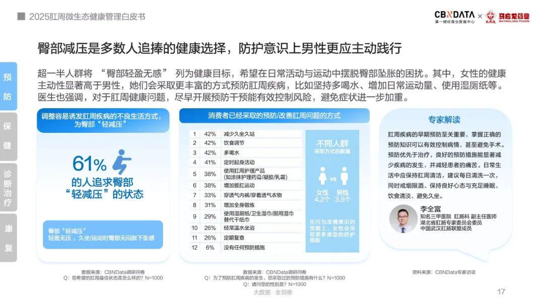 全周期管理的观念,始于意识的觉醒。数据显示,40%的受访者首次关注肛周健康源于社媒科普,但“久坐”“玩手机导致排便过长”等不良习惯仍是普遍隐患。可喜的是,积极的转变正在发生,尤其女性正展现出更高的健康主动性,通过减少久坐、调节饮食、使用肛周护理产品等方式进行预防。这标志着健康管理正从“治已病”逐渐转向“防未病”,并以提升生活品质为重要目标。
