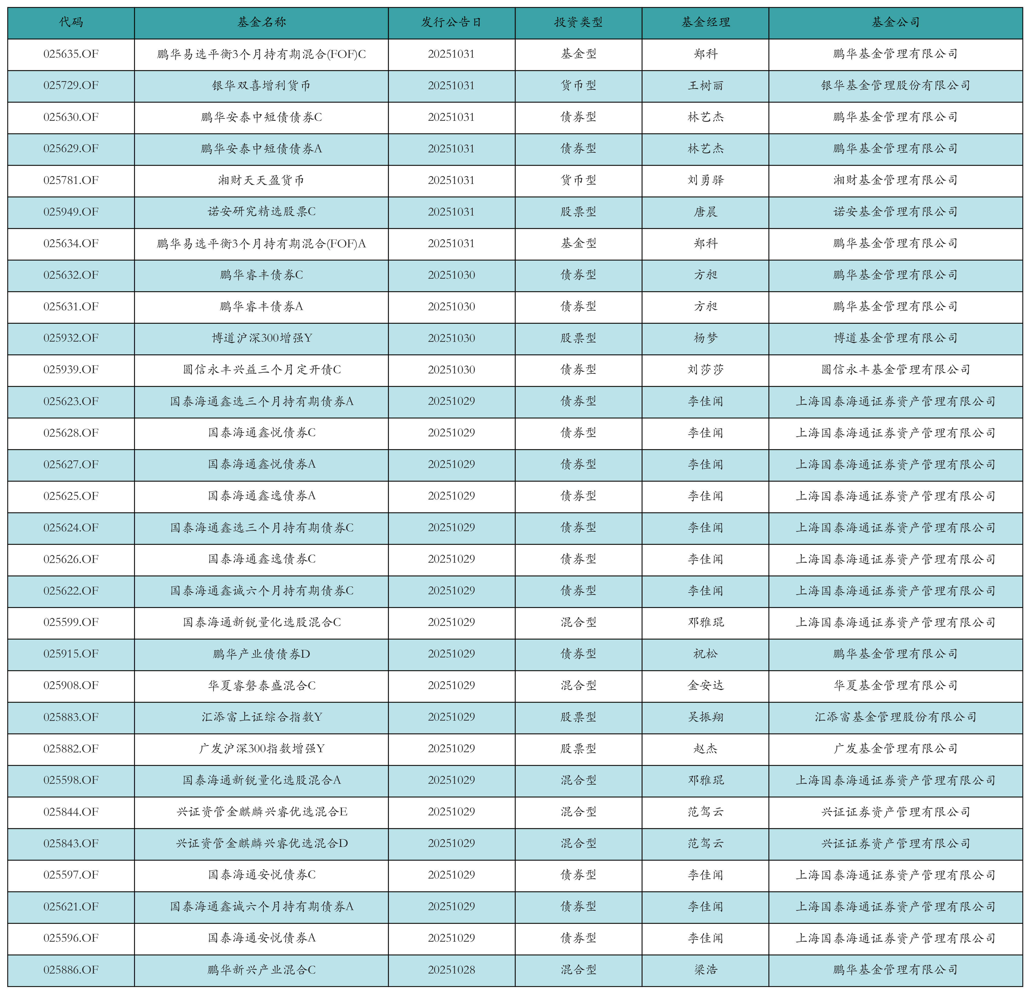 上周有30只新基金发行,分别为:鹏华易选平衡3个月持有期混合(FOF)C、银华双喜增利货币、鹏华安泰中短债债券C、鹏华安泰中短债债券A、湘财天天盈货币、诺安研究精选股票C、鹏华易选平衡3个月持有期混合(FOF)A、鹏华睿丰债券C、鹏华睿丰债券A、博道沪深300增强Y、圆信永丰兴益三个月定开债C、国泰海通鑫选三个月持有期债券A、国泰海通鑫悦债券C、国泰海通鑫悦债券A、国泰海通鑫逸债券A、国泰海通鑫选三个月持有期债券C、国泰海通鑫逸债券C、国泰海通鑫诚六个月持有期债券C、国泰海通新锐量化选股混合C、鹏华产业债债券D、华夏睿磐泰盛混合C、汇添富上证综合指数Y、广发沪深300指数增强Y、国泰海通新锐量化选股混合A、兴证资管金麒麟兴睿优选混合E、兴证资管金麒麟兴睿优选混合D、国泰海通安悦债券C、国泰海通鑫诚六个月持有期债券A、国泰海通安悦债券A、鹏华新兴产业混合C,详情见下表: