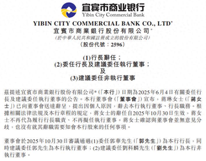 10月30日,宜宾银行发布公告称,因个人原因,蒋琳辞去该行执行董事、行长职务。