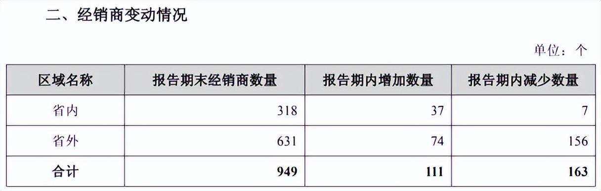 经销商网络的变化也反映出金徽酒区域扩张的困境。截至三季度末,金徽酒经销商总数为949家,其中省内318家,省外631家。前三季度净减少52家经销商,其中省外经销商减少82家,这一数据表明其在省外市场的扩张步伐不仅放缓,甚至出现收缩。