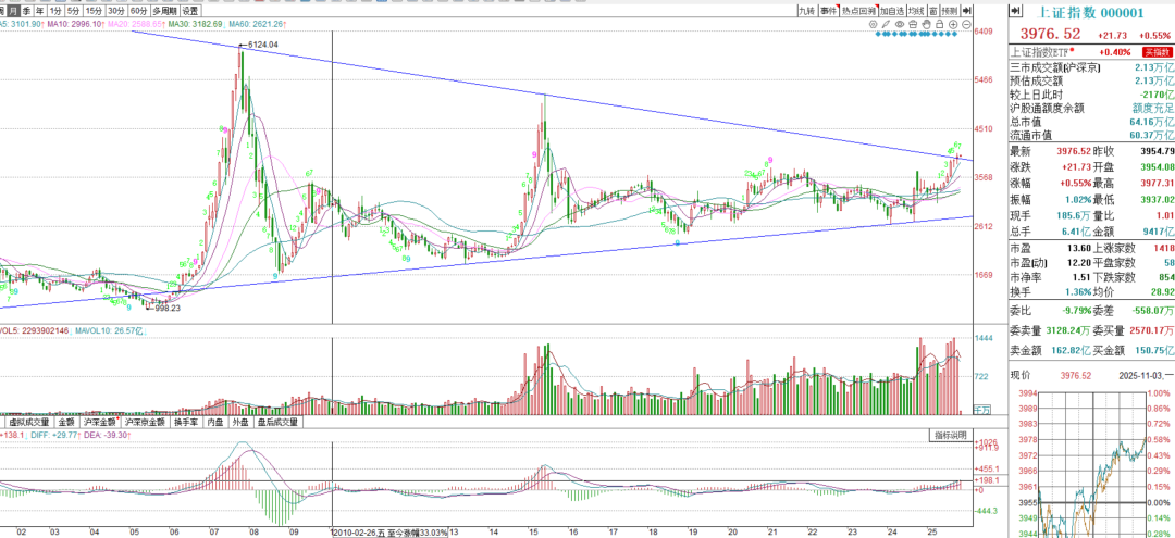 11月3日,如果仅仅从技术面解释10月底大盘回落,那么就很简单,就是沪指突破3920-3940点区域的压力线之后,完成了一次回踩,而今天11月K线沪指直接开盘就站上了这个压力线。