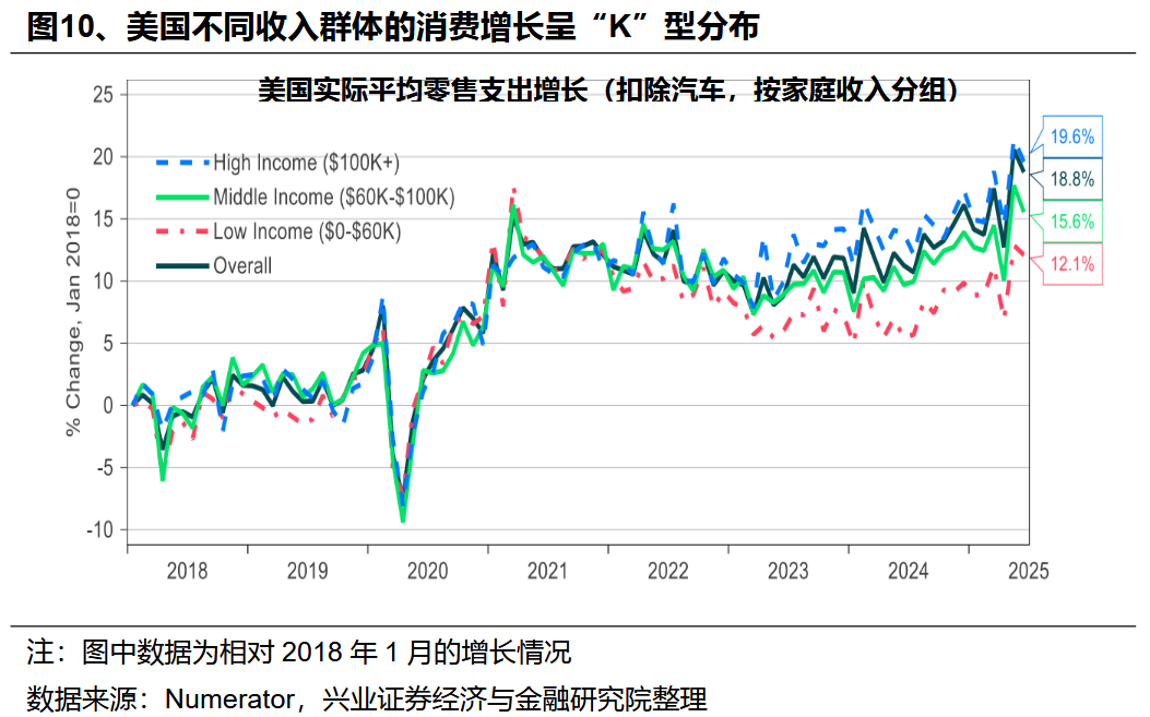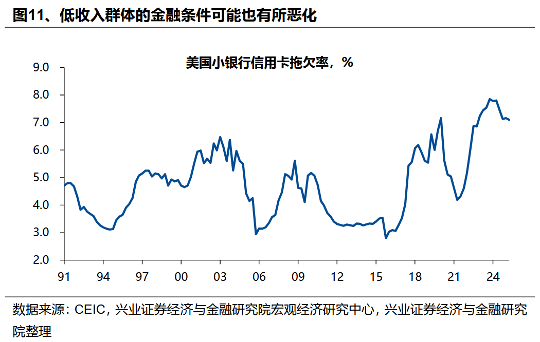 也导致低收入群体消费乏力、金融条件恶化。根据Numerator的调查数据,自2022年底以来,美国不同收入群体的实际零售支出呈现明显“K型”分化,高收入群体消费支出增长显著,但低收入群体在联储降息前已陷入增长停滞。这一分化也体现在金融层面,美国小银行信用卡拖欠率明显上升,反映底层民众财务压力相对较高。