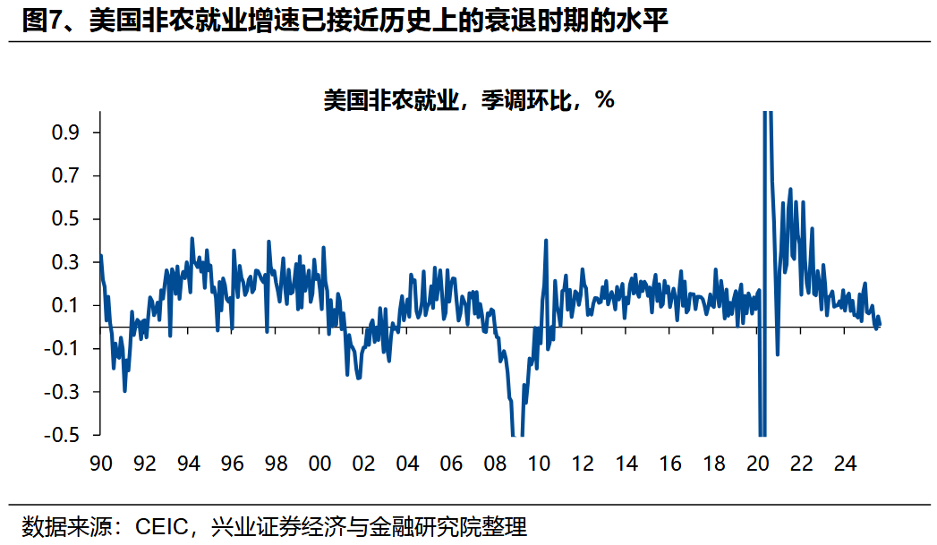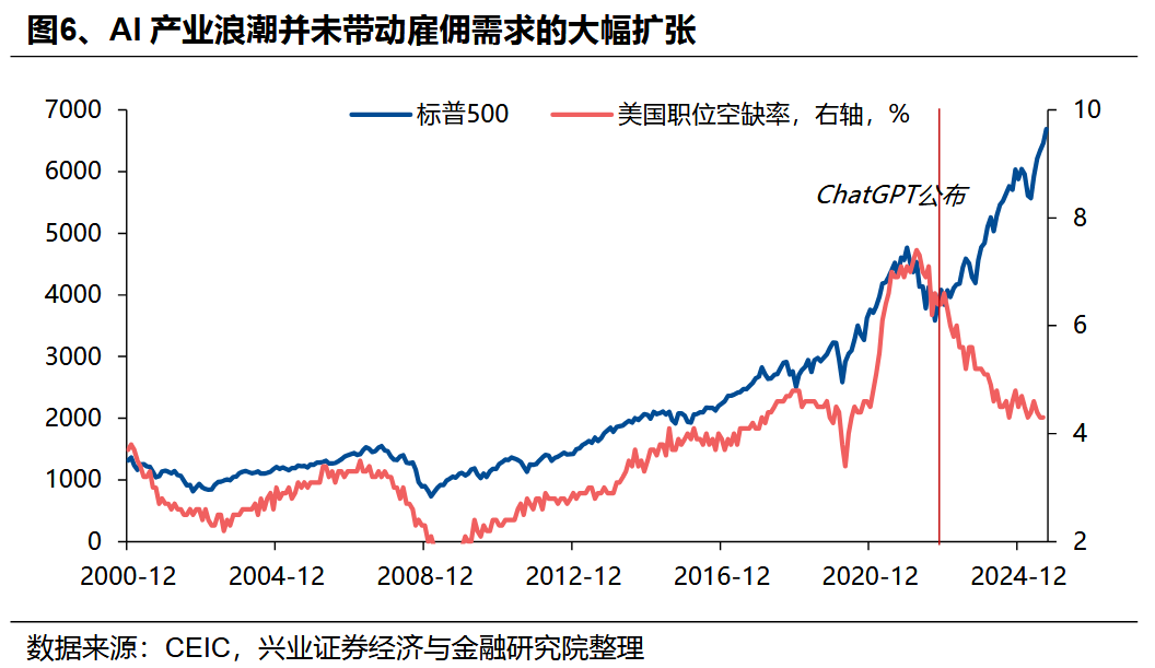 因而,自2022年底以来,美国就业市场指标与资本市场表现或整体经济表现出现背离——就业指标“衰退”与资本市场“繁荣”并存。由于AI企业“重资本轻人力”的特征,自2022年ChatGPT面世以来,尽管其通过前述企业盈利增长、资本开支扩张带动美国资本市场及GDP的增长,但其对就业市场的拉动作用非常有限。两个典型的指标,一是美国职位空缺率(招工率)快速下行,当前下行的时长甚至已超过过去几轮经济危机时期;二是非农就业环比增速已降至0附近,这也是以往在其他经济指标仍保持韧性的环境下罕见的情况。
