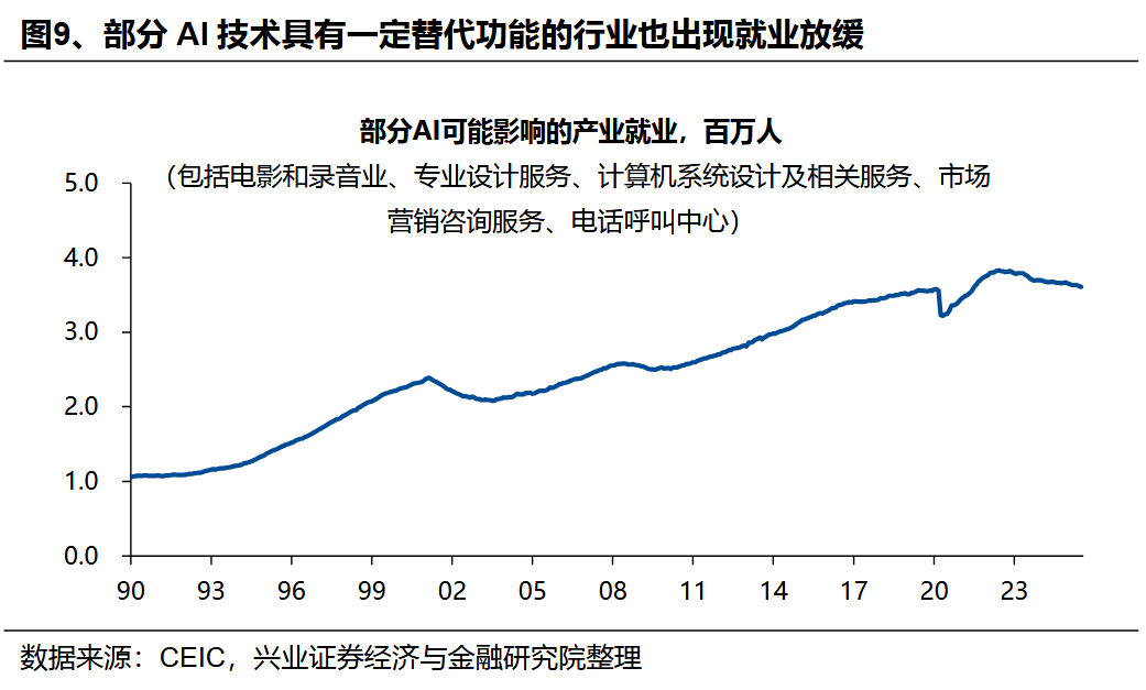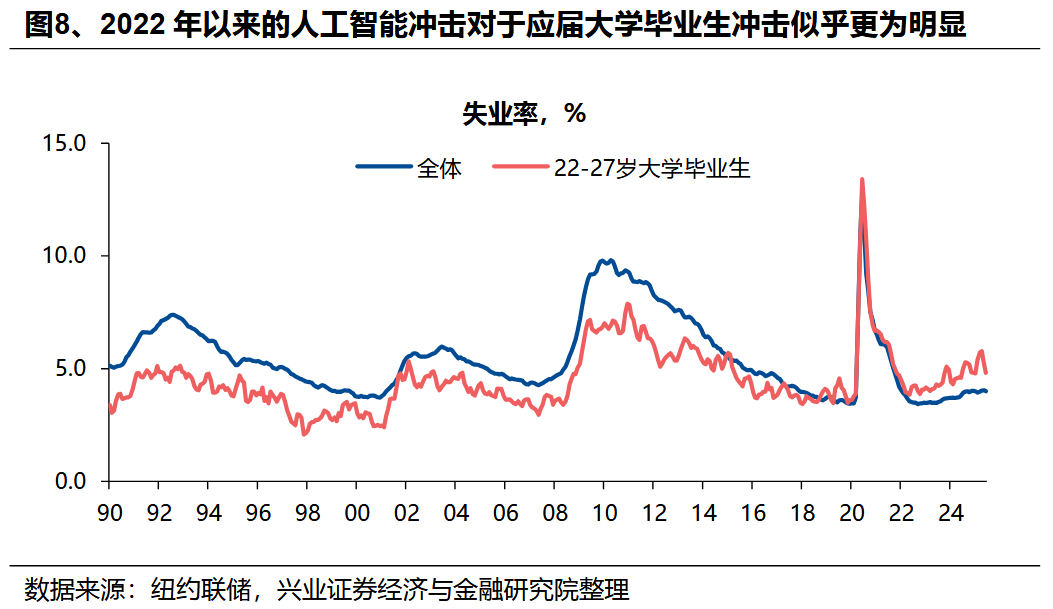 甚至,AI产业可能正在导致部分特定领域的就业面临“被替代”的风险。自2022年底以来,美国新大学毕业生的失业率上升较快,且高于整体的失业率水平,这与以往经济周期呈现的规律存在显著差异。这一现象一方面可能源于整体招工需求持续大幅下滑,另一方面或与AI可替代工种的覆盖人群相关——此类工种多对应需从事一定初级脑力活动的群体,而应届毕业生恰好是该群体的重要组成部分。此外,从行业维度观察,部分应用具备替代功能的AI技术的行业,如电话呼叫中心、编程等领域,也出现了就业增长放缓的情况。