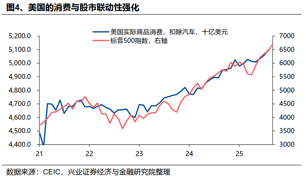 更重要的是,美国经济近年来愈发依赖高收入人群,使得整体经济指标体现出一定的“韧性”。根据穆迪估算[4],美国收入最高的10%家庭(定义为年收入约25万美元及以上)的消费支出占全国总比重近三十年来从36%大幅上升至49.7%,创历史新高,美国国内生产总值(GDP)的增长严重依赖高收入群体的消费习惯,收入前10%群体的支出至少贡献了三分之一的GDP。换言之,考虑到美国以消费为主导的经济体特征,美国经济正愈发地依赖高收入人群。近期鲍威尔也曾指出美国经济日益依赖高收入人群的事实[2]。另一个表征此现象的指标是,美国的实际商品消费(剔除近年受供给端波动影响较大的汽车)与高收入人群财富效应直接相关的股票市场表现的相关性正进一步增强。