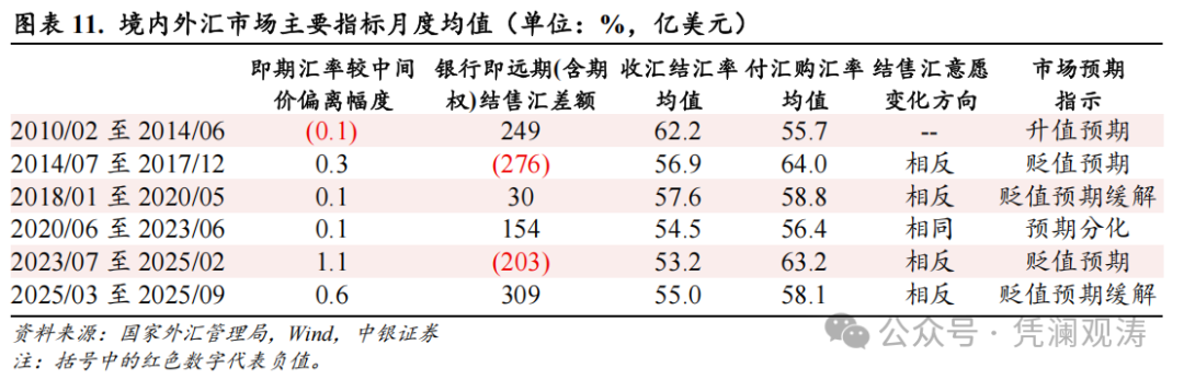 不过,今年3月份以来,境内外汇供求关系发生逆转,主要源于市场主体购汇动机减弱,而非结汇意愿增强。3至9月份,付汇购汇率均值为58.1%,较2023年7月至2025年2月均值回落5.1个百分点,收汇结汇率均值则仅回升了1.8个百分点。究其原因,这可能与2014年年中以来汇率预期总体偏贬值方向,付汇购汇率处于相对高位有关。其实,无论在汇率贬值预期增强阶段(如2014年7月至2017年底,2023年7月至2025年2月),还是在贬值预期缓解阶段(如2018年初至2020年5月,2025年3月至9月),付汇购汇率变动幅度均大于收汇结汇率(见图表11)。收汇结汇率长期处于相对低位,意味着未来汇率预期一旦转向升值方向,可能会触发市场主体结汇需求集中释放。坚持市场在汇率形成中的决定性作用,保持汇率弹性,发挥好汇率调节宏观经济和国际收支自动稳定器功能,为自主、有效实施货币政策创造有利条件的同时,仍需坚持底线思维,强化预期引导,坚决防范汇率超调风险。