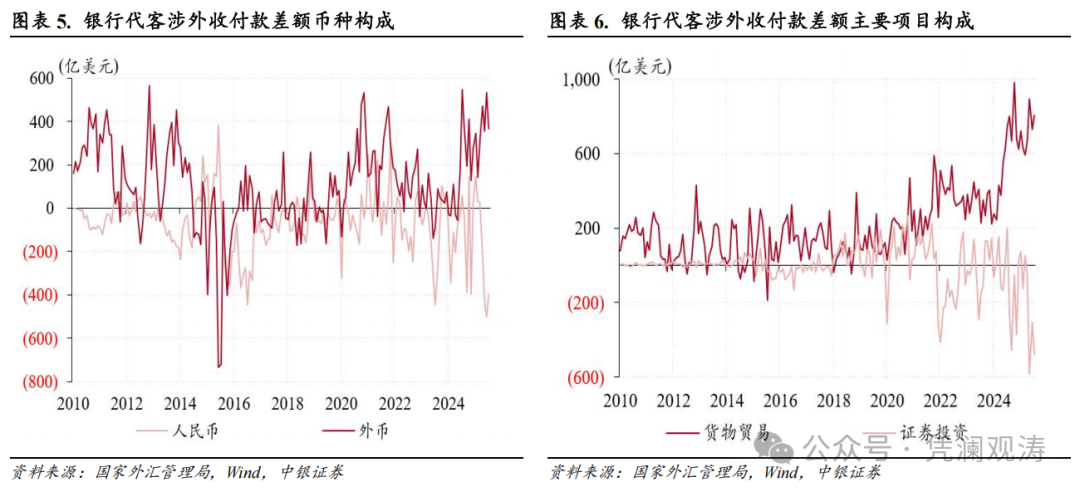 分项目看,证券投资仍然是银行代客涉外收付款重回逆差的主要贡献项,贡献率为271%,直接投资、服务贸易、收益和经常转移、货物贸易的贡献率则分别为65%、10%、-77%、-120%(见图表6)。